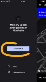 Sollte es mit dem abspielen des Audios Probleme geben, kann es helfen den Walk zu stoppen und wieder neu einzusteigen. Natürlich ist es auch sinnvoll den Walk in der App zu stoppen, wenn man die Tour beenden möchte. Die Screenshots zeigen wo man die Funktion findet: